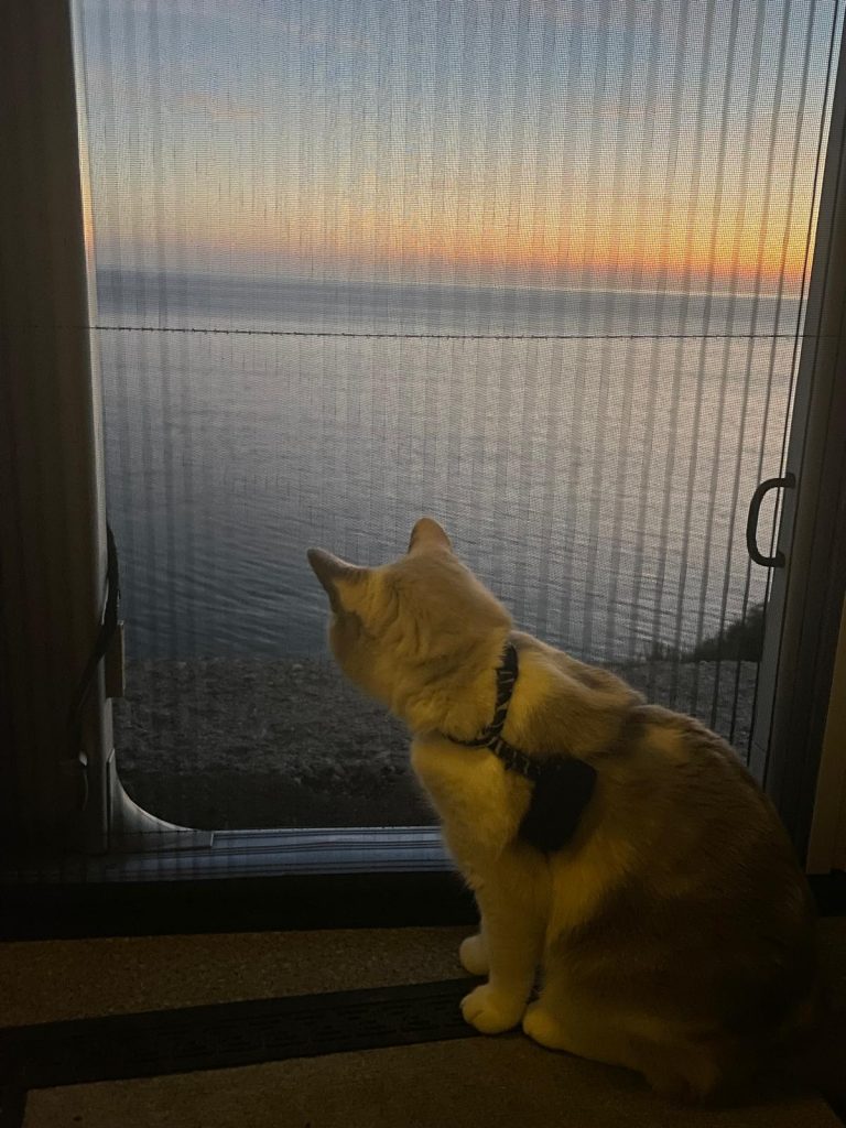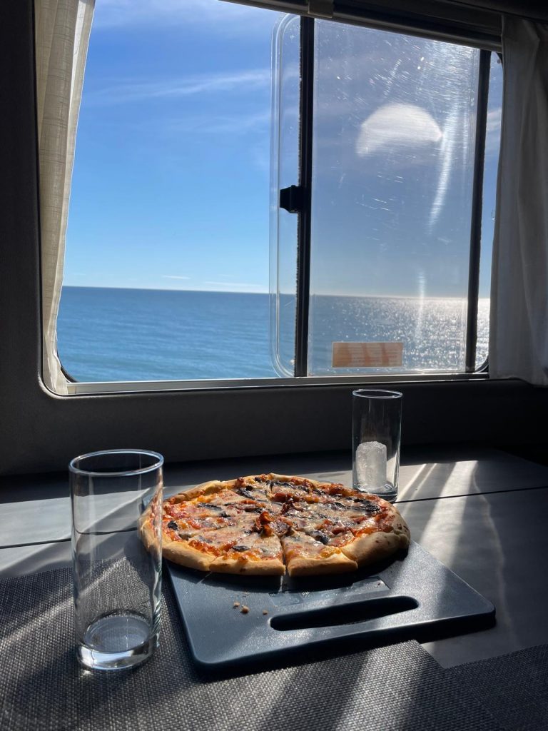 Decidimos almorzar en la autocaravana, ya que no hay restaurantes ni servicios cerca, pero el lugar lo compensa con su belleza. Desde la playa pudimos disfrutar de un atardecer precioso, viendo cómo el sol se escondía lentamente en el mar, tiñendo el cielo de tonos anaranjados y rosados.La noche fue muy tranquila, arrullados por el sonido del mar, y al amanecer disfrutamos de un espectáculo inolvidable: el sol asomando sobre el horizonte, visible directamente desde la ventana a los pies de nuestra cama.